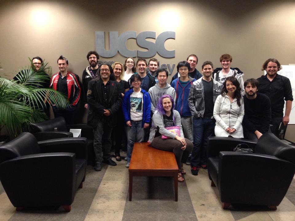 I’m on the advisory board for the UC Santa Cruz Games & Playable Media masters program. The program is headed by Brenda and John Romero. Its very first year of students recently graduated, and following the students’ progress and watching their games to completion was a great experience, and I’m honored and glad I could help. Here’s a picture of everyone; faculty, students, and advisers: